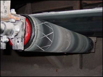 斗轮机悬臂皮带跑偏尤其严重,自投产以来因皮带跑偏造成的皮带磨损严重,每年至少更换2--3次皮带。由于悬臂皮带短,机长只有35米,且是双向运行,该皮带跑偏治理一直是电厂检修治理的重点工作,目前使用的国产调偏托辊,起到一定的效果,但是由于国产调偏拖辊两侧装有立辊,时间久了就会造成皮带边胶破损(如下图所示),皮带边胶破损后由于渗入雨水,造成皮带两侧伸缩不一样,使皮带跑偏更严重,尤其是近期,悬臂梁经过这些年的使用,近斗轮侧有不同程度的变形,也造成皮带机架不正,使皮带严重跑偏。